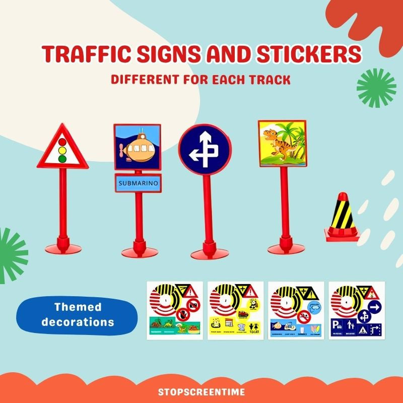 Complete tracks include 12 pieces, 12 signs, 1 vehicle and stickers, while extensions include 4 pieces and 1 vehicle.